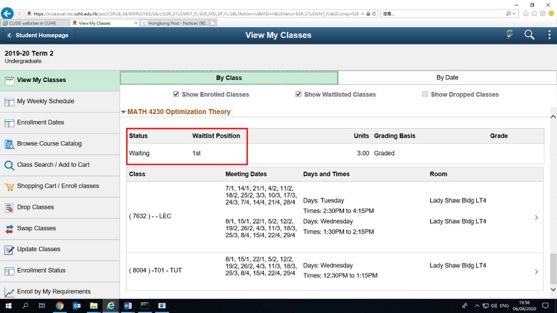 你可按「Manage Classes」,再選「View My Classes」查閱自己於候補名單中的位置。